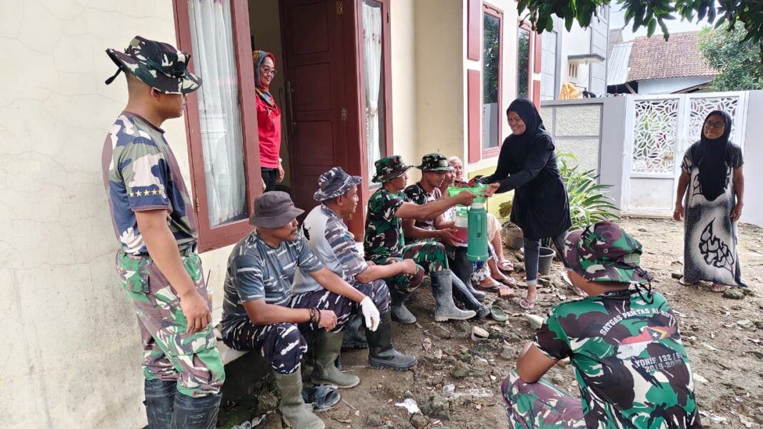Dua orang ibu rumah tangga, Ibu Suparti (45) dan Ibu Waryunah (49), tampak berjalan menuju titik pengerjaan sasaran fisik sambil membawa satu teko besar teh manis hangat dan kopi untuk dibagikan kepada para prajurit yang sedang melepas lelah.