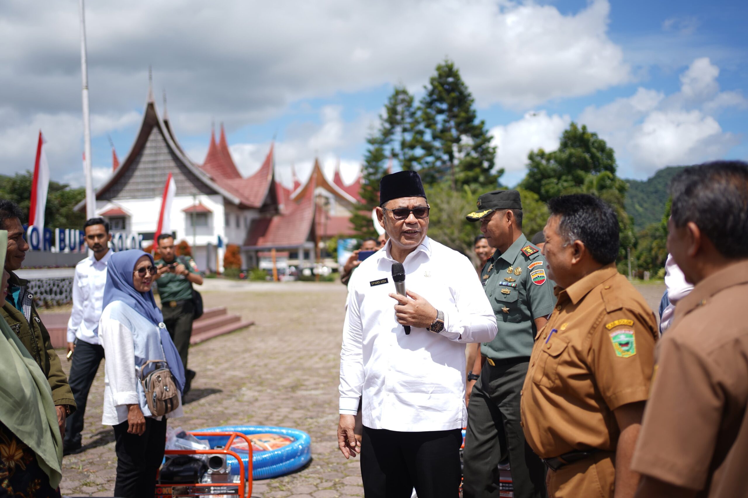 Secara simbolis, Bupati Solok Capt. H. Epyardi Asda, M.Mar, bersama Dandim 0309 Solok Letkol Kav Sapta Raharja, S.I.P, dan Ketua TP-PKK Ny Emiko Epyardi Asda, SP, menyerahkan bantuan pompa air guna perluasan areal tanam (PAT) padi di Kabupaten Solok. Sebanyak 84 unit pompa air diserahkan kepada kelompok tani, terdiri dari 79 unit pompa air 3 inchi dan 5 unit pompa air 4 inchi.