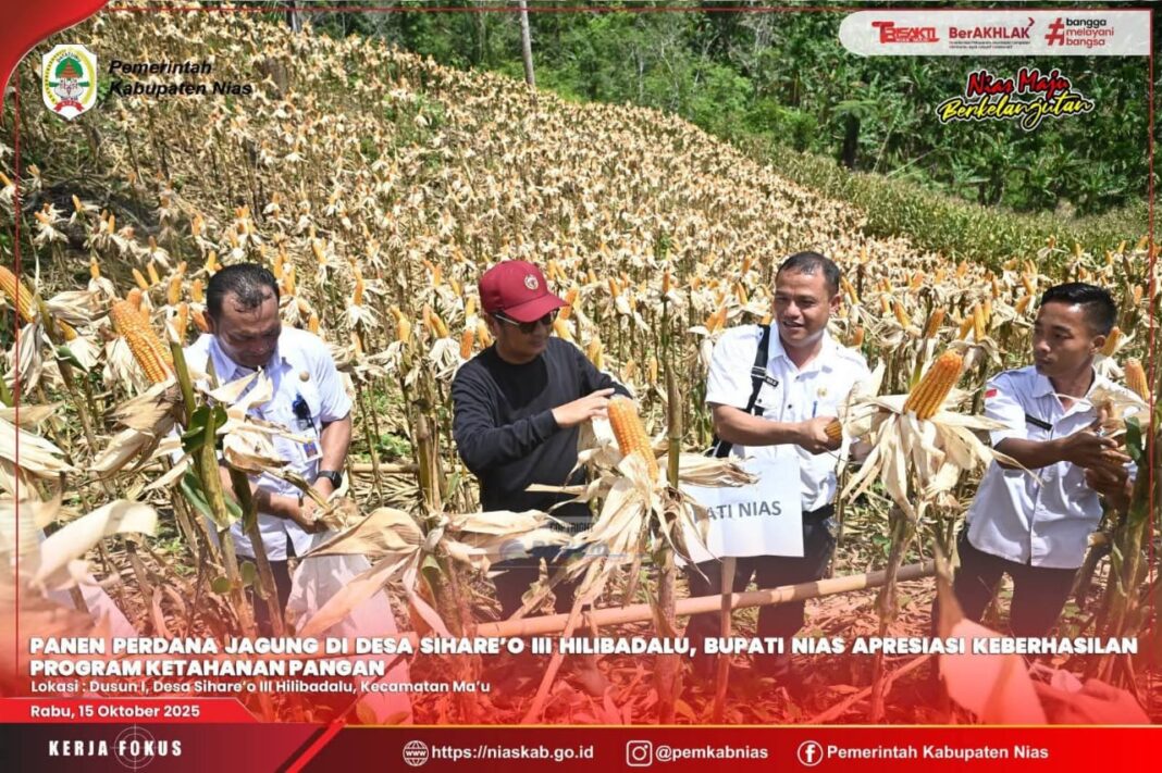 Nias, dutametro.com ,- Bupati Nias Yaatulo Gulo, S.E., S.H., M.Si menghadiri kegiatan Panen Perdana Jagung di Lahan Ketahanan Pangan Dusun I, Desa Sihare’o III Hilibadalu, Kecamatan Ma’u. Rabu, 15/10/2025