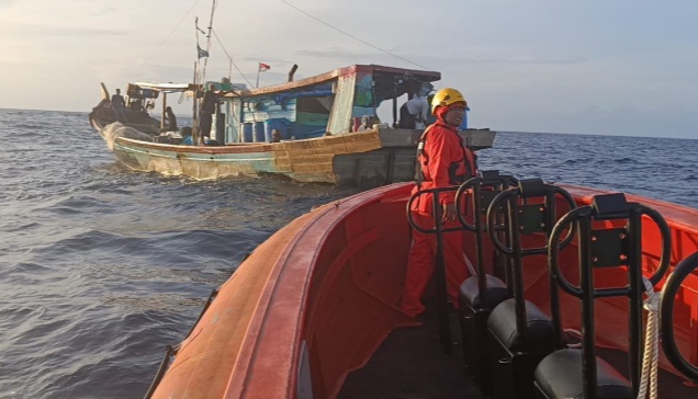 KN SAR melakukan towing/tender terhadap kapal survivor menuju Pelabuhan Sikakap, didampingi RIB 02.