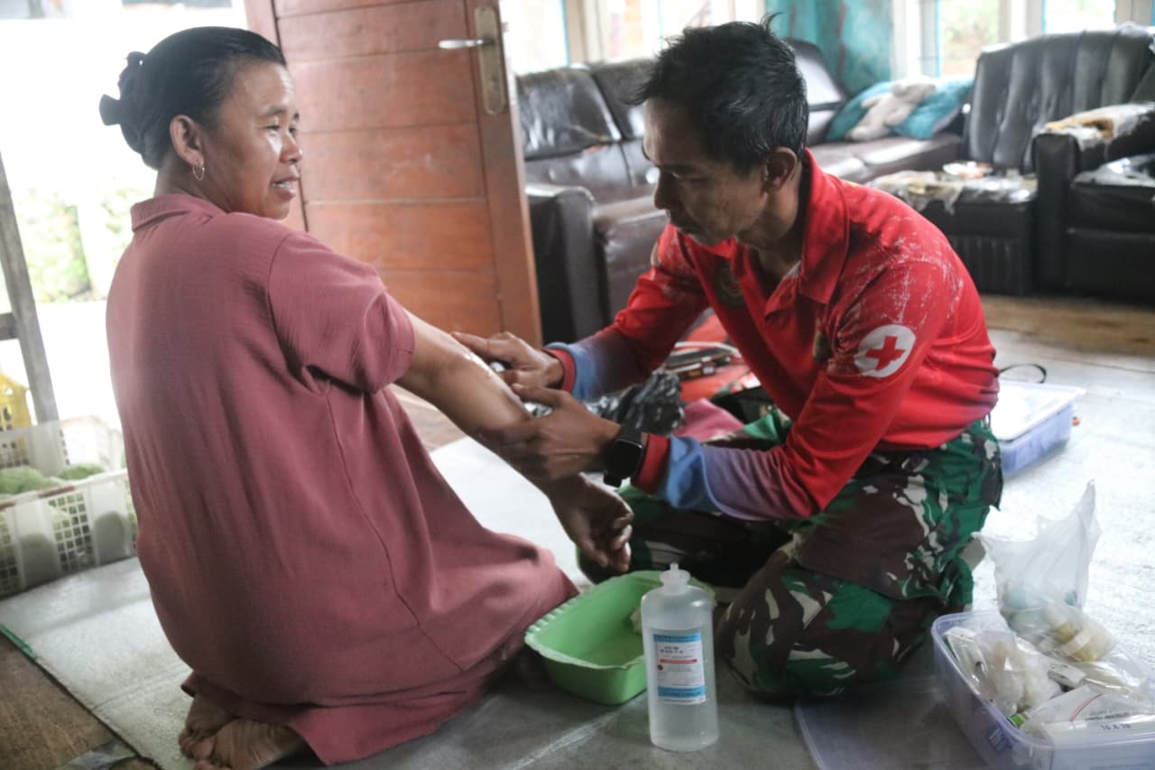 Cipelah, Kab. Bandung – Tim Kesehatan TMMD ke-127 Kodim 0624/Kab. Bandung memberikan pelayanan kesehatan kepada masyarakat Kampung Simpang Gunung Leutik RT 02 RW 03 Desa Cipelah, Kecamatan Rancabali, Kabupaten Bandung. Pada hari Senin, 16 Februari 2026, tim kesehatan memberikan pertolongan kepada Ibu Tini Suhartini yang mengalami cedera akibat terjatuh dari tangga.