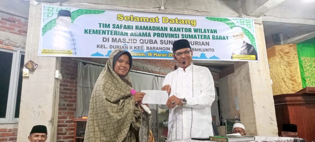 Sawahlunto,dutametro.com – Kepala kantor wilayah Kementerian Agama Provinsi Sumatera Barat Mustafa pimpin Tim Safari Ramadan Kanwil Kemenag Provinsi Sumatera Barat di Masjid Quba Sungai Durian Kelurahan Durian II Kecamatan Barangin Kota Sawahlunto, Senin (16/03/2026). Turut mendampingi kepala kantor Kemenag Sawahlunto Dedi Wandra.