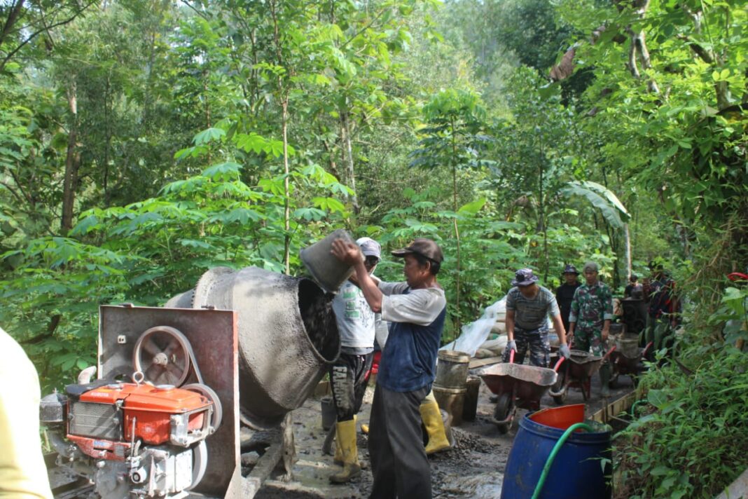 Keringat membasahi seragam loreng. Nafas tersengal tertutup suara mesin yang terus meraung. Namun tak satu pun langkah surut. Dengan semangat gotong royong, TNI dan masyarakat bergantian menuang, mengaduk, dan meratakan—seolah sedang menanam harapan agar kelak jalan ini benar-benar menghidupkan desa.