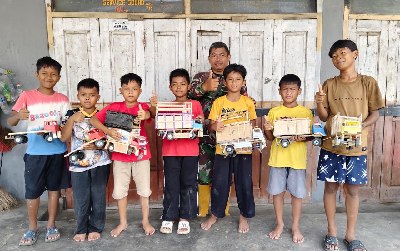 Pemandangan penuh keakraban ini terjadi di pelataran rumah warga. Dengan memanfaatkan bahan-bahan sederhana yang ada di sekitar, Serka Bangun dengan sabar membimbing jari-jemari mungil anak-anak Desa Cikuya untuk merakit mainan kreatif.