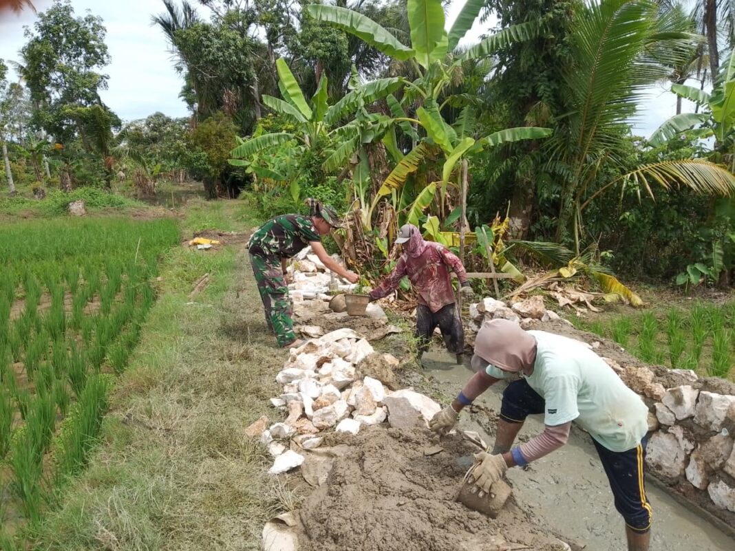 Personel Satgas TMMD bersama masyarakat setempat bahu membahu menyelesaikan pekerjaan dengan semangat gotong royong. Sinergi antara TNI dan warga menjadi kunci utama dalam percepatan pengerjaan di lapangan.