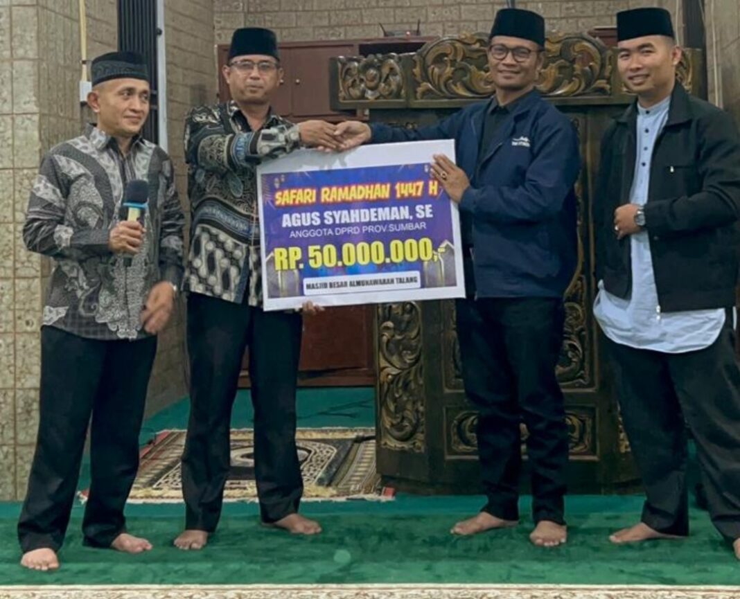 Talang – Nuansa religius dan penuh kebersamaan terasa kental di Masjid Besar Al Munawwarah, Nagari Talang, Rabu (18/03/2026). Kunjungan Tim Safari Ramadhan Anggota DPRD Provinsi Sumatera Barat Agus Syahdeman, SE (Angku Imam Bandaro) menjadi momen istimewa bagi masyarakat setempat.