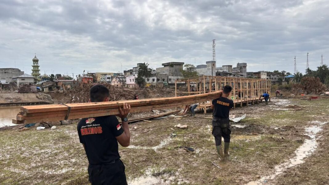 Aceh Tamiang – Personel Satuan Tugas (Satgas) Aman Nusa II Polda Aceh kembali menunjukkan kepedulian terhadap kebutuhan dasar masyarakat. Pada Rabu (17/12/2025), Satgas Aman Nusa II Aceh Tamiang melaksanakan pembangunan dan penyaluran fasilitas MCK (Mandi, Cuci, Kakus) umum di bawah Jembatan Kuala Simpang, Kecamatan Karang Baru, Kabupaten Aceh Tamiang.