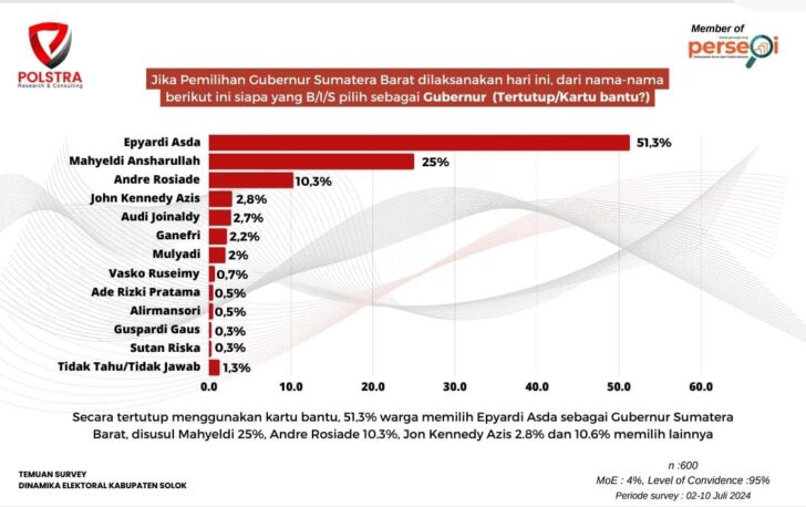 Temuan dalam survei Polstra tersebut mencatat bahwa elektabilitas Mahyeldi di Kabupaten Solok sebesar 25 persen, lalu disusul Andre Rosiade 10,3 persen.