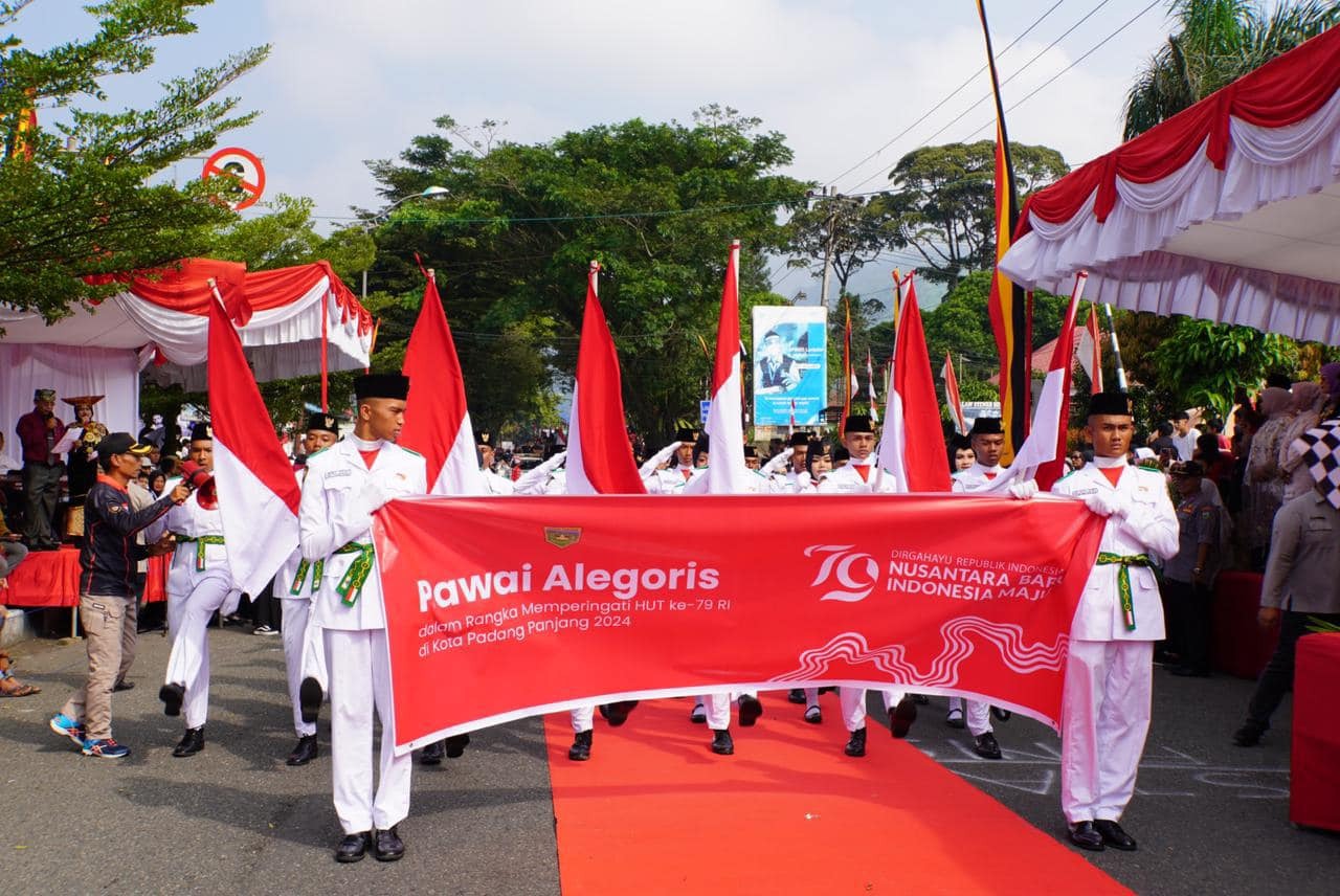 PADANG PANJANG, dutametro.com – Ribuan warga tumpah ruah menyaksikan pawai alegoris merayakan HUT ke-79 Kemerdekaan RI. Jalan Sudirman, tepatnya di depan Kantor BRI, dipadati masyarakat yang antusias menyaksikan berbagai atraksi dan kreasi peserta.