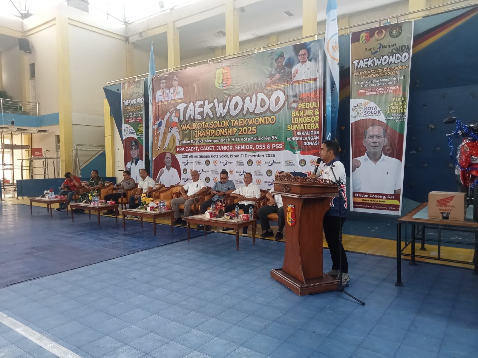 Wali kota Solok Dr.H.Ramadhani Kirana Putra dalam sambutannya mengatakan, kegiatan yang sangat positif dan multi tujuan, sekaligus sebagai ajang adu kemampuan dan ketangkasan para Taekwondoin muda menuju atlet Taekwondo andalan daerah.