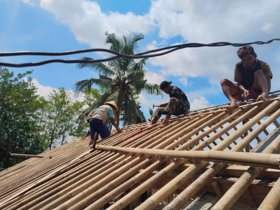 Dengan langkah pasti dan koordinasi yang rapi, para prajurit bahu-membahu mengangkat dan memasang usuk satu per satu. Setiap palu yang diketukkan bukan sekadar pekerjaan konstruksi, tetapi menjadi simbol nyata kepedulian TNI kepada rakyat.