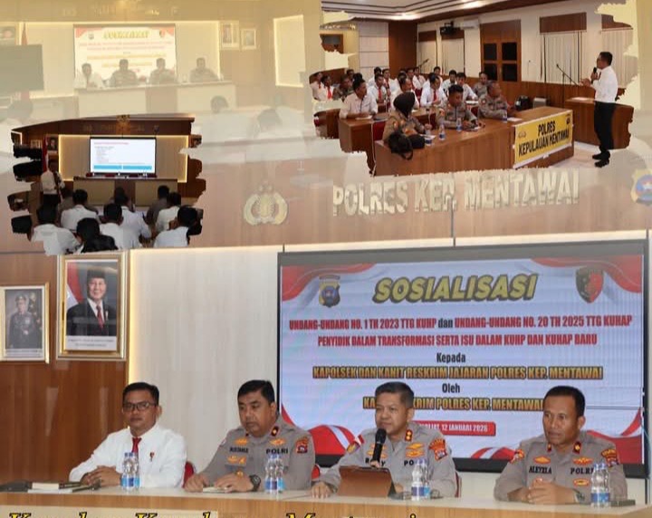 Tuapejat,Dutametro.com.-Kapolres Kepulauan Mentawai, AKBP Rory Ratno A., S.E., M.M., M.Tr.Opsla, membuka langsung acara sosialisasi UU No. 1 Tahun 2023 tentang KUHP dan UU No. 20 Tahun 2025 tentang KUHAP baru kepada Kapolsek dan Kanit Reskrim jajaran Polres Kepulauan Mentawai. Sosialisasi ini dilaksanakan di Aula Polres Kepulauan Mentawai, Senin (12/1)