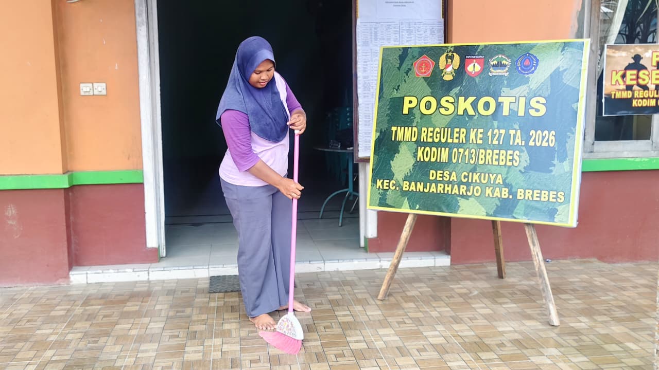 BREBES – Semangat kemanunggalan TNI dengan rakyat tidak hanya terlihat dari pembangunan fisik jalan atau jembatan, namun juga terpancar dari ketulusan hati warga Desa Cikuya. Hal ini dibuktikan oleh Ibu Antem (41), seorang pekerja kebersihan di Kantor Desa Cikuya yang secara sukarela turut merawat kebersihan Pos Komando Taktis (Poskotis) TMMD Reguler ke-127 Kodim 0713/Brebes.
