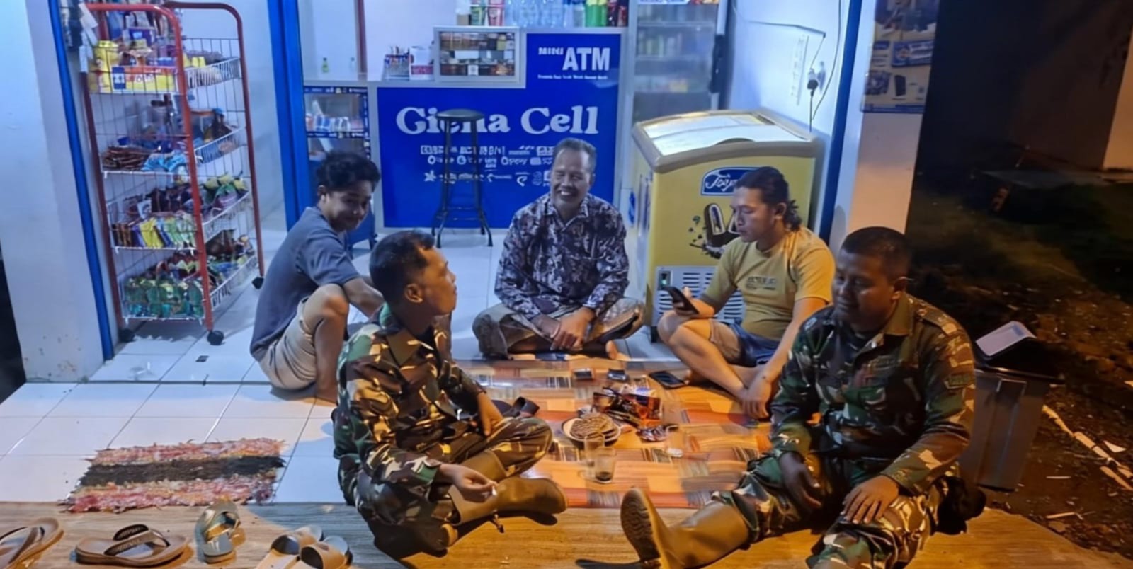 Terlihat dua anggota Koramil 14/Banjarharjo, Serma Suyitno dan Serda Suyatno, duduk lesehan bersama warga di depan sebuah kios “Giana Cell”. Tanpa sekat formalitas, obrolan mengalir hangat di atas tikar sederhana, menciptakan suasana akrab yang menjadi ciri khas kemanunggalan TNI dan rakyat.