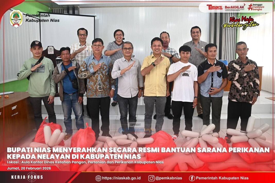 Nias, dutametro.com .- Bupati Nias Yaatulo Gulo, menyerahkan bantuan sarana perikanan kepada para nelayan di Kabupaten Nias yang dilaksanakan di Aula Kantor Dinas Ketahanan Pangan, Pertanian dan Perikanan Kabupaten Nias. Jumat, 20/02/2026.