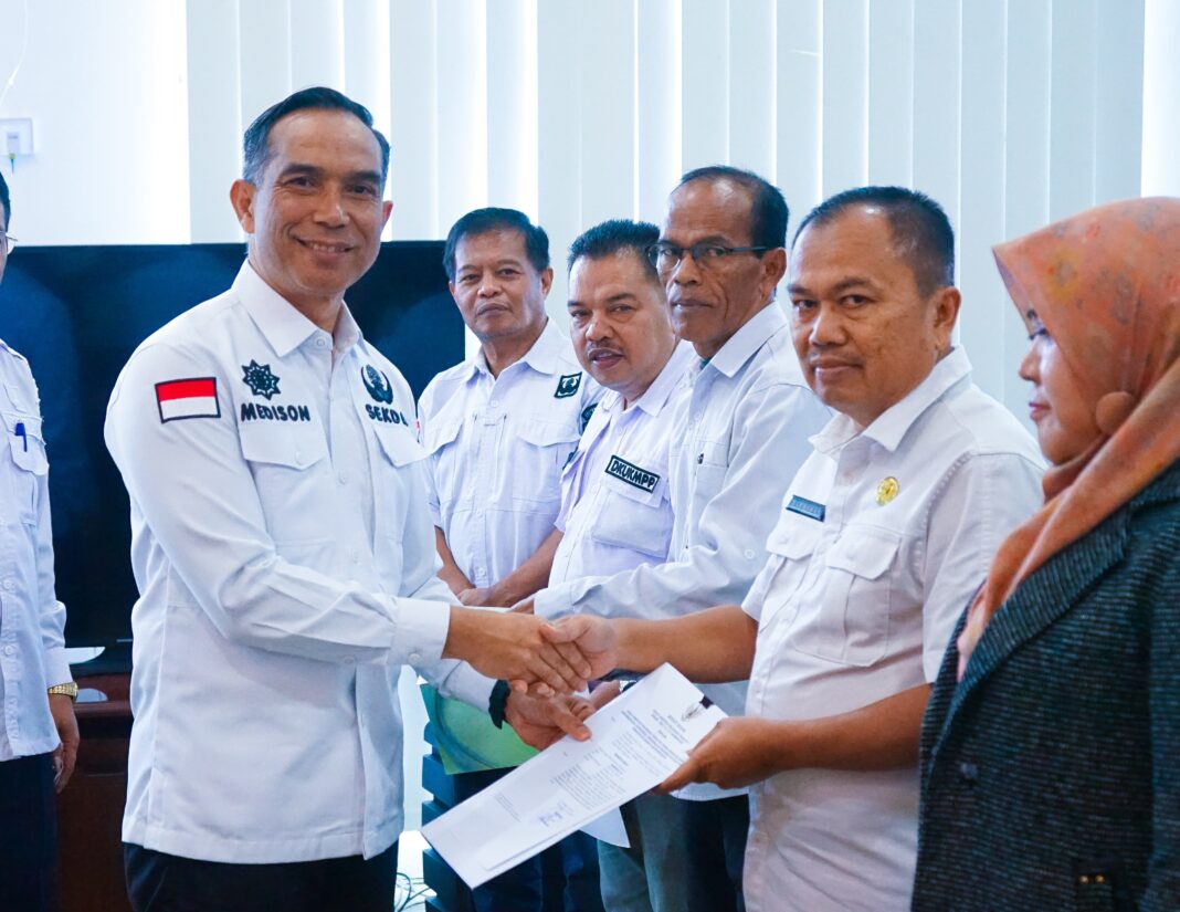 Kab. Solok, – Sekretaris Daerah Medison menyerahkan surat perintah Pelaksana Tugas (Plt) kepada pejabat yang akan mengisi struktur kelembagaan di Badan Pendapatan Daerah (Bapenda) Kabupaten Solok. Kegiatan tersebut berlangsung di Ruang Sekretariat Daerah dan dihadiri oleh Asisten Administrasi Editiawarman, Kepala BKPSDM Afriandi, serta para pejabat penerima tugas, Rabu (22/01/2025).
