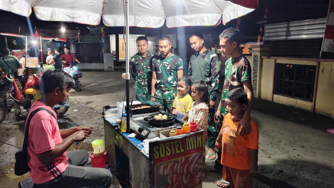 Momen ini dimanfaatkan para prajurit untuk melepas penat setelah seharian bekerja di lokasi sasaran fisik. Tak hanya sekadar mencari hiburan, kehadiran para anggota Satgas ini juga menjadi berkah tersendiri bagi para pedagang UMKM setempat.