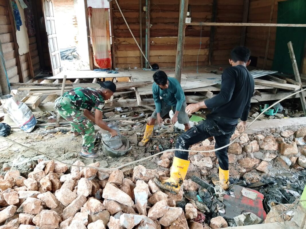 Personel Satgas bersama warga bahu-membahu membongkar dan membangun kembali struktur bangunan yang sebelumnya memprihatinkan.