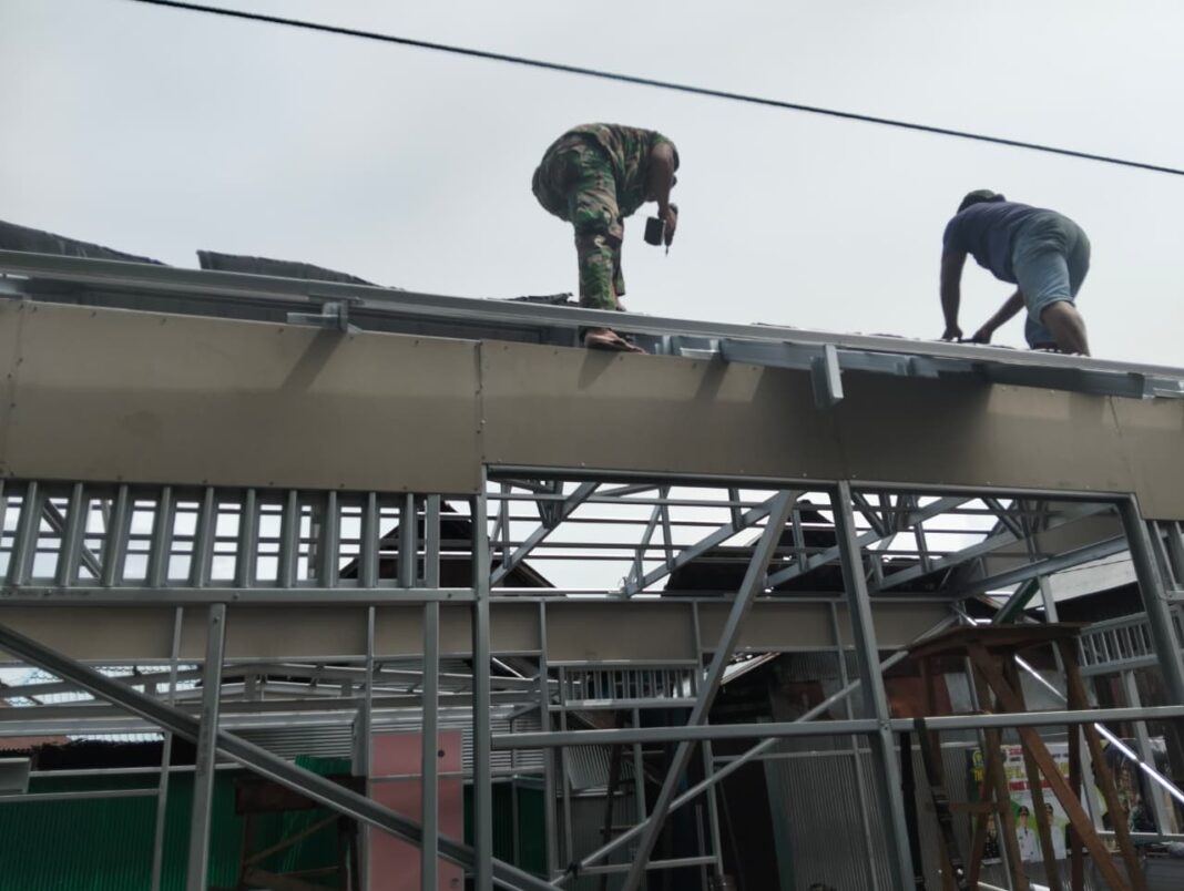 Amuntai – Program TNI Manunggal Membangun Desa (TMMD) ke-127 Tahun Anggaran 2026 yang dilaksanakan Kodim 1001/Hulu Sungai Utara–Balangan terus menunjukkan komitmennya dalam membantu masyarakat kurang mampu. Salah satu sasaran fisik berupa rehabilitasi Rumah Tidak Layak Huni (RTLH) milik Nenek Jumiati kini telah memasuki tahapan penting, yakni pemasangan rangka atap rumah.