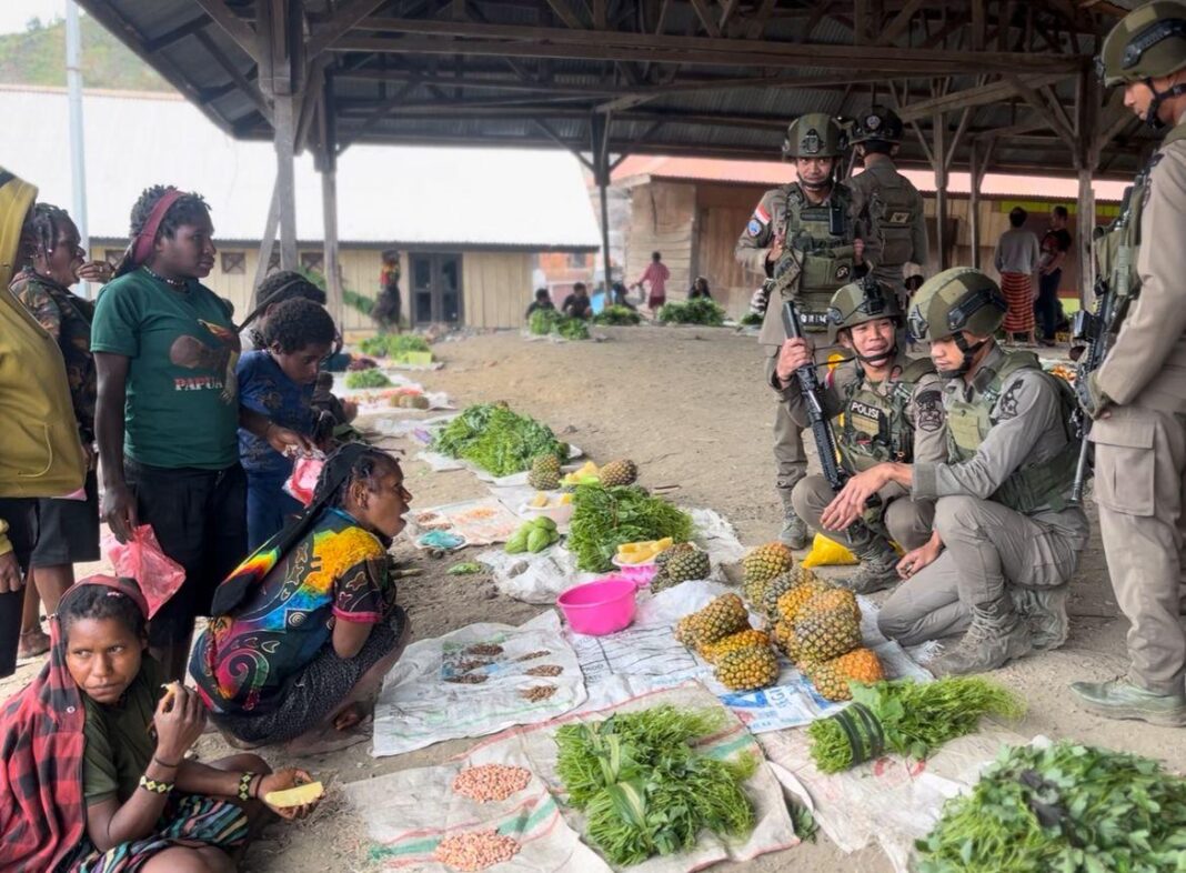 Puncak – Aktivitas Pasar Distrik Sinak, Minggu (22/3/2026), tampak lebih hidup dari biasanya. Di tengah rutinitas jual beli, kehadiran personel Satgas Operasi Damai Cartenz 2026 tidak hanya menjalankan patroli keamanan, tetapi juga membawa dampak langsung bagi para pedagang lokal, khususnya mama-mama Papua.