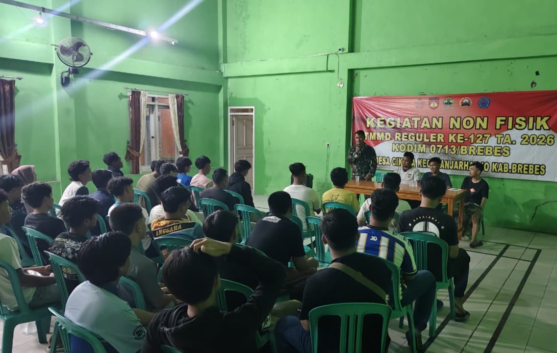 Brebes – Anggota Satgas TMMD Reguler ke-127 Kodim 0713/Brebes terus memperkuat sinergi dengan elemen masyarakat di lokasi sasaran. Bertempat di Desa Cikuya, Kecamatan Banjarharjo, Satgas TNI melakukan pendekatan persuasif dengan merangkul generasi muda yang tergabung dalam Karang Taruna Abhinaya Dharma, Senin (23/02/2026).