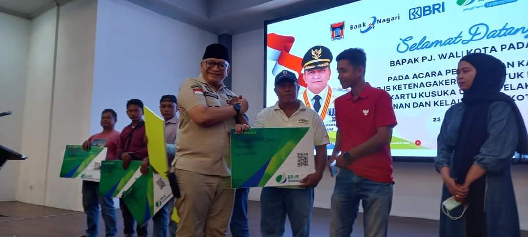 Penyerahan Kartu BPJS Ketenagakerjaan dan KASUKA dilakukan Pj Wako Padang Andree Algamar di Gedung Youth Center, Jumat (23/8/2024).