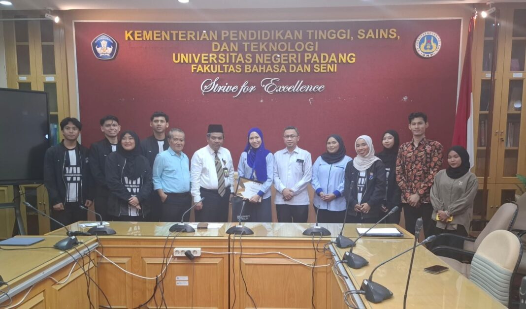 PADANG – Delegasi Kolej 7 Universiti Malaya, Malaysia akan melakukan lawatan seni dan akademik ke Fakultas Bahasa dan Seni Universitas Negeri Padang. Utusan Delegasi Universiti Malaya yang dipimpin oleh Puan Aida Nurul Ain Abd Rahman diterima secara langsung oleh Dekan Prof. Dr. Ermanto, S.Pd., M.Hum., Wakil Dekan Dr. Havid Ardi, M.Hum., Wakil Dekan Prof. Indrayuda, M.Pd., Ph.D., Kabag, Pejabat Fungsional di Fakultas Bahasa dan Seni Universitas Negeri Padang.