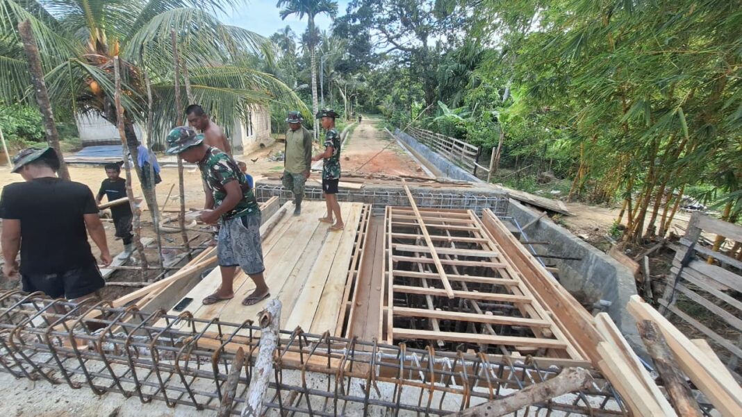 Dalam pantauan di lapangan, para prajurit bersama warga setempat bahu-membahu merakit rangka besi dan menyiapkan bekisting lantai jembatan.