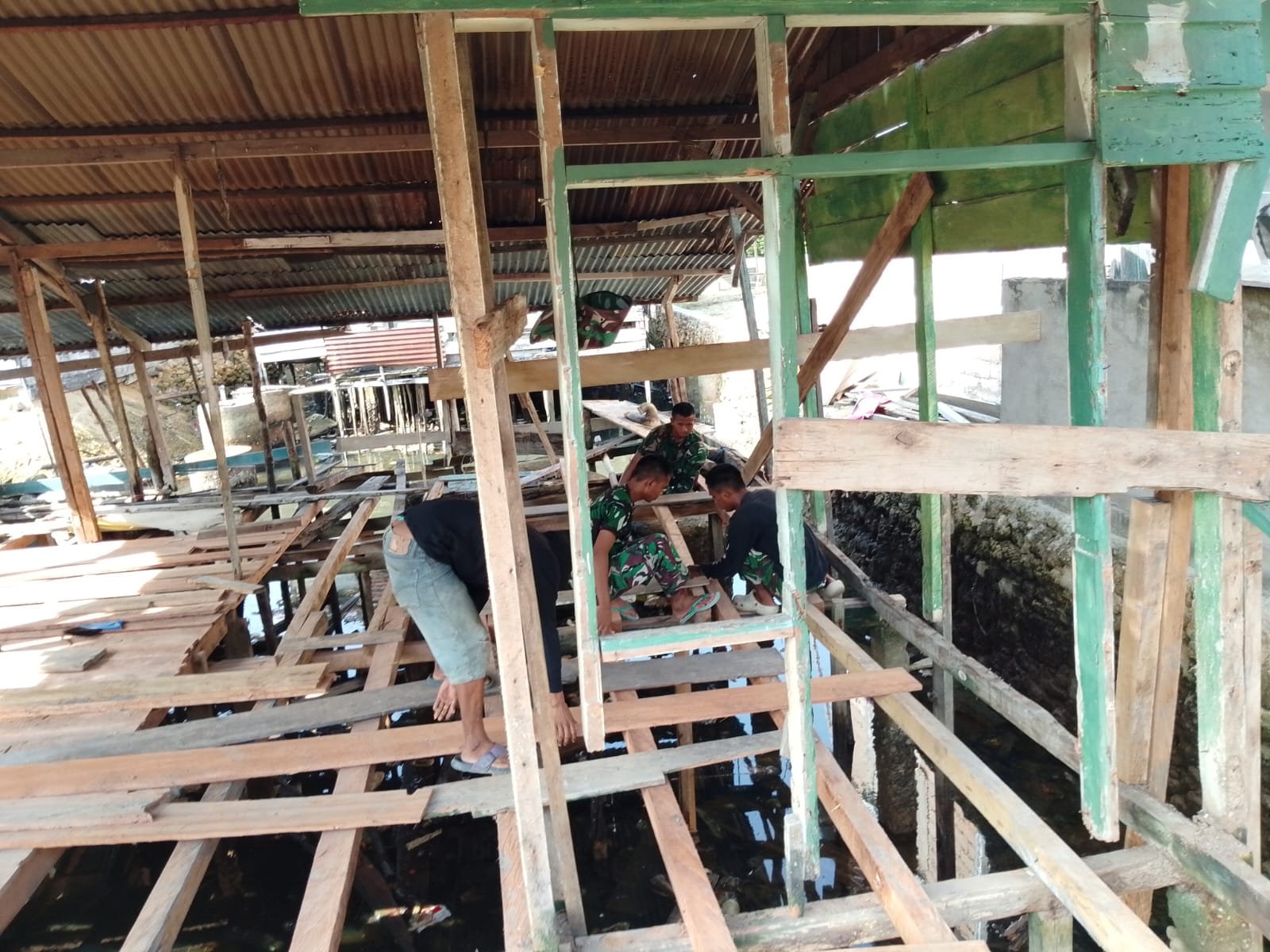 Pada tahapan terbaru, sejumlah personel terlihat bahu-membahu melakukan pemasangan gelagar dan penyusunan lantai rumah menggunakan material papan kayu yang berkualitas.