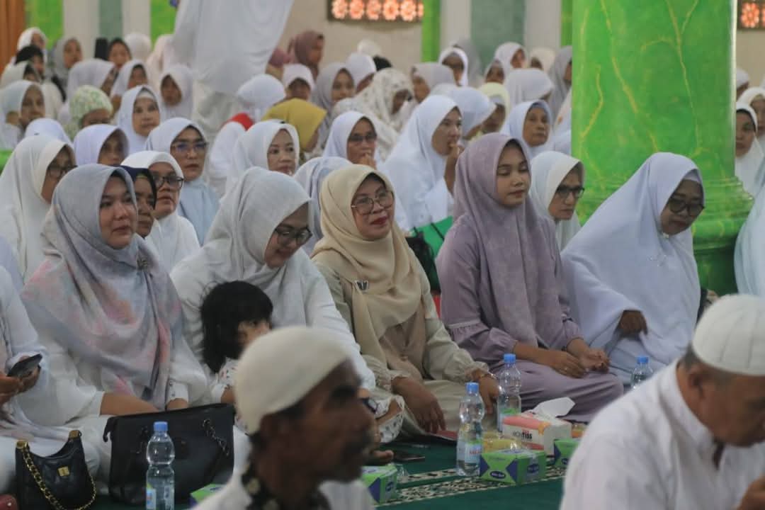 Wakil Bupati Dharmasraya, Leli Arni, hadir langsung di tengah jamaah, menunjukkan komitmennya terhadap penguatan nilai-nilai spiritual dan sosial di tengah masyarakat.