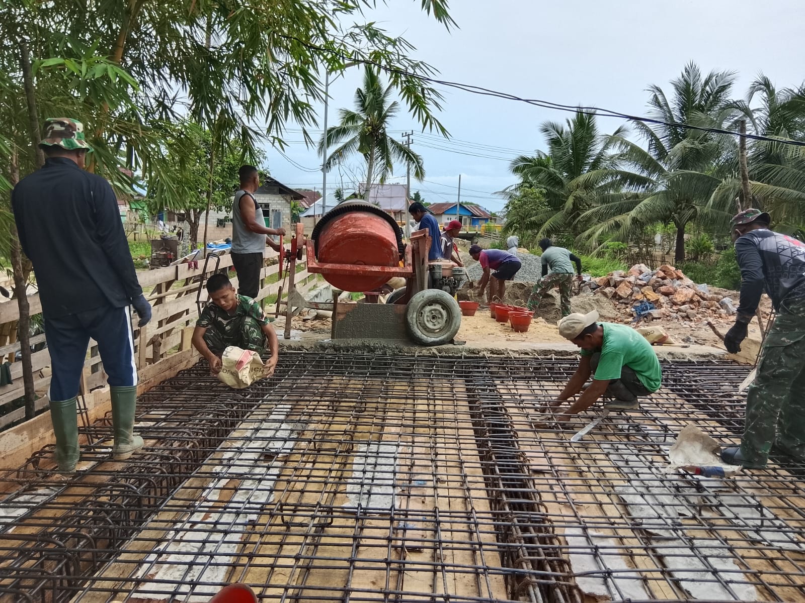 Meski di bawah terik matahari, semangat gotong royong tampak kental saat para prajurit dan warga bahu-membahu merangkai besi tulangan dengan presisi tinggi.