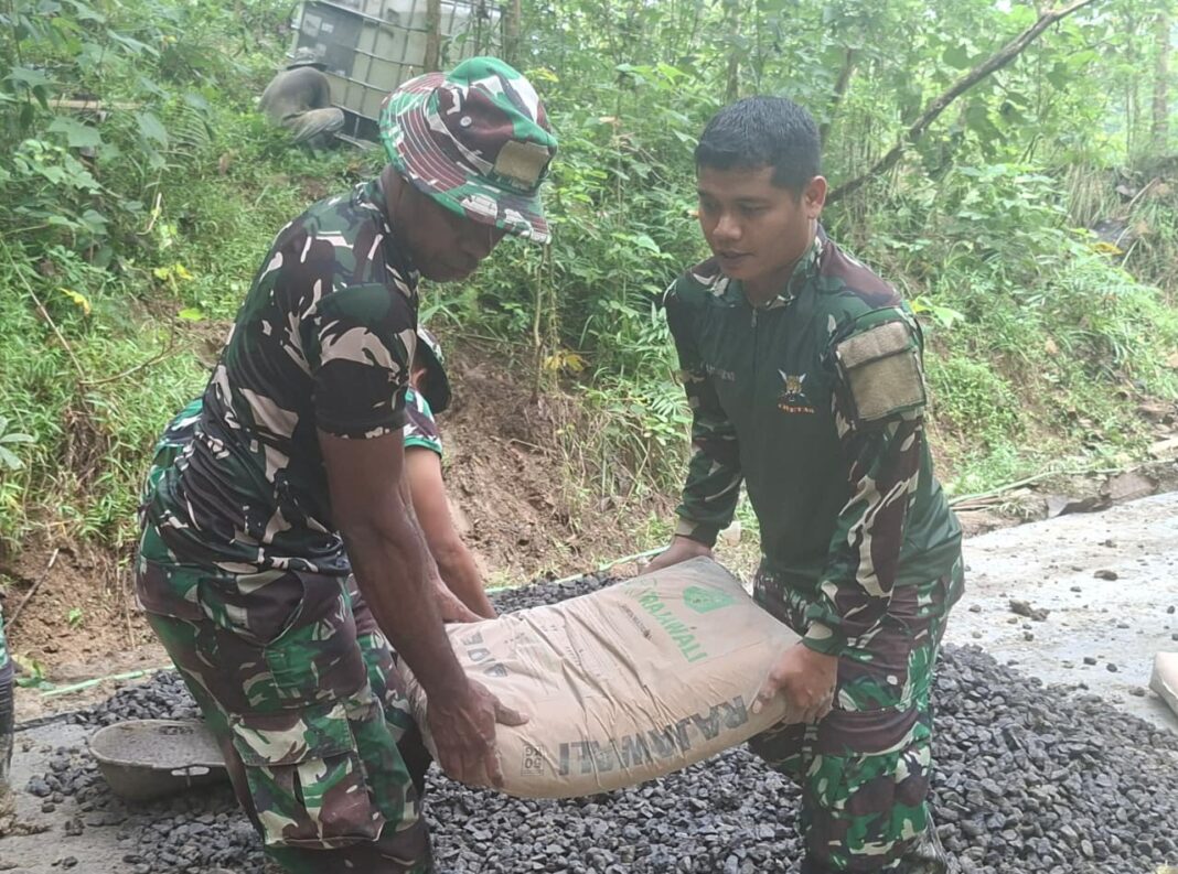 BREBES – Jiwa kepemimpinan di lapangan tidak selalu soal perintah, tapi soal teladan. Hal inilah yang dibuktikan oleh Koptu Agus Suryatno, anggota Satgas TMMD Reguler ke-127 Kodim 0713/Brebes dari kesatuan Yonif 406/Candra Kusuma. Di tengah terik matahari, ia tampak bersemangat mengangkat karung-karung semen untuk material pengecoran jalan di Desa Cikuya, Kamis (26/02/2026).