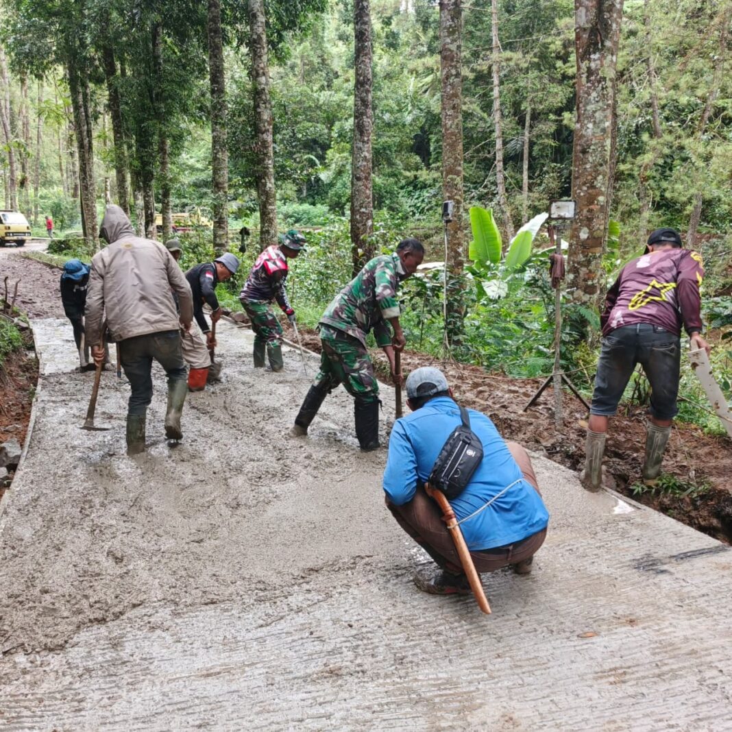 KABUPATEN BANDUNG – Anggota Satuan Tugas Pembinaan Masyarakat Desa (TMMD) Reguler Ke-127 Kodim 0624/Kabupaten Bandung bersama masyarakat Desa Cipelah, Kecamatan Rancabali, melaksanakan kegiatan pengecoran jalan pada hari Kamis (26/2) pukul 16.00 WIB hingga selesai, bertempat di Kampung Simpang Babakan Garut.