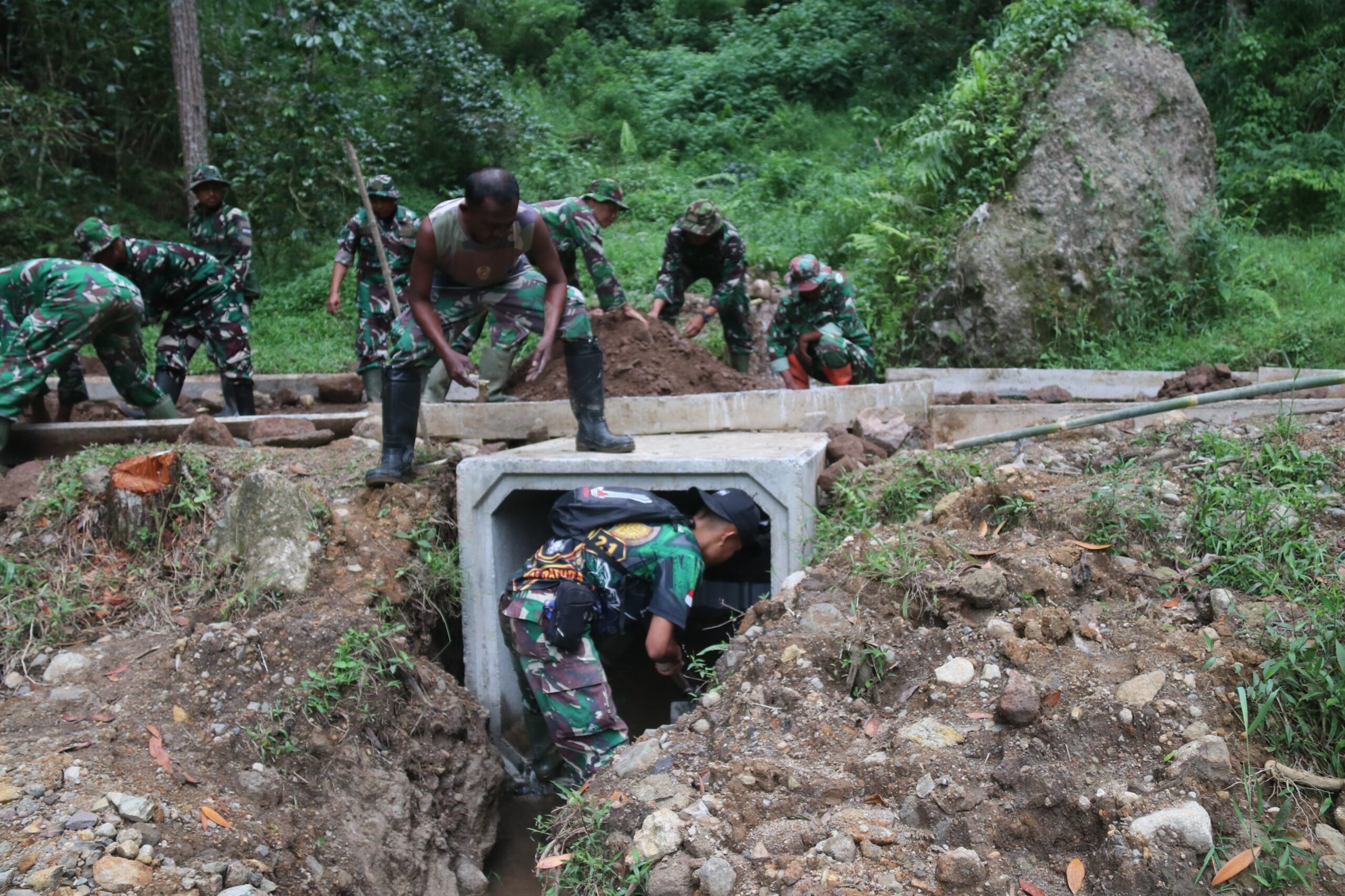 Rancabali – Satgas TMMD Reguler Ke-127 Kodim 0624/Kab. Bandung bersama masyarakat setempat melaksanakan kegiatan fisik pemasangan box culvert saluran air di titik 600 Kampung Simpang Babakan Garut Desa Cipelah, Kecamatan Rancabali, Kabupaten Bandung, pada Kamis (26/2/2026).