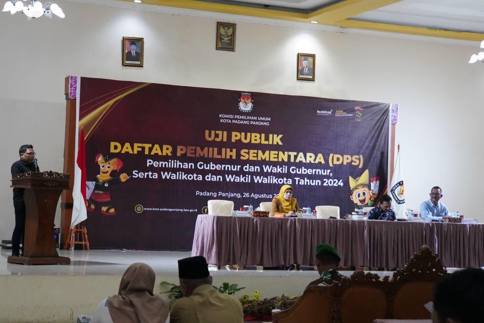 PADANG PANJANG, dutametro.com – Komisi Pemilihan Umum (KPU) Kota Padang Panjang gelar Uji Publik Daftar Pemilih Sementara (DPS) Pemilihan Gubernur dan Wakil Gubernur serta Wali Kota dan Wakil Wali Kota (Pilkada) 2024 di Auditorium Mifan, Senin (26/8/2024).