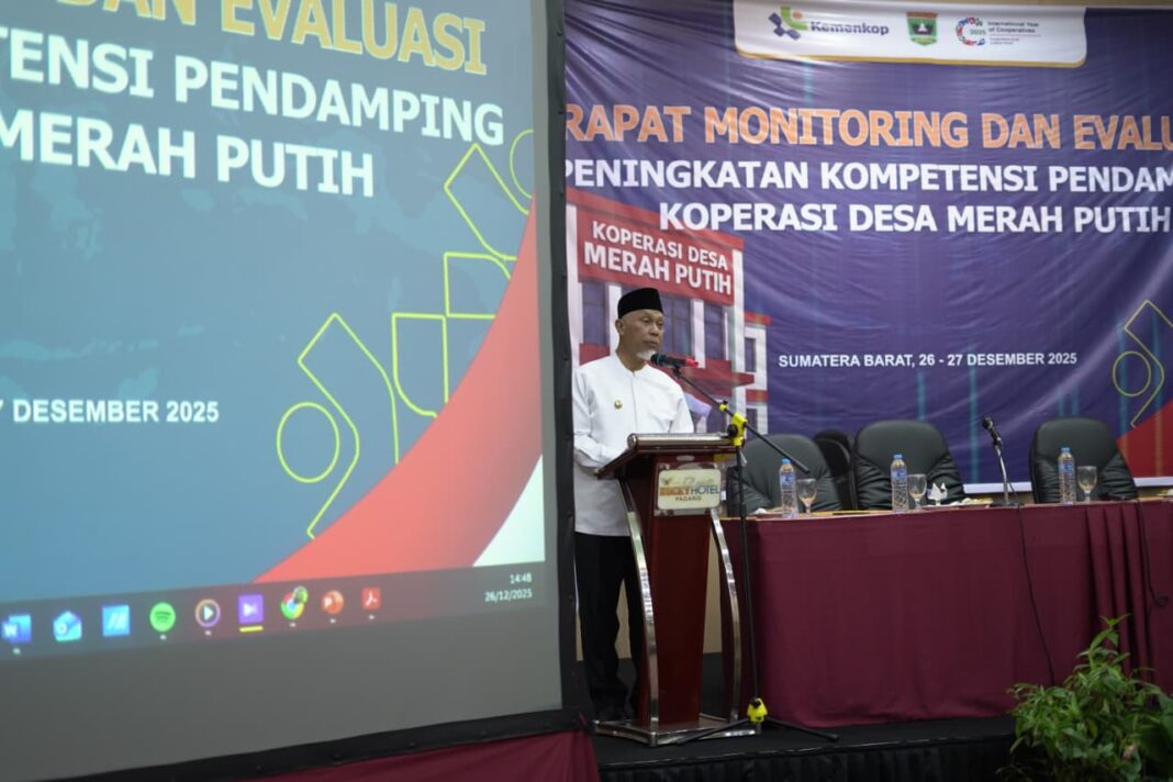 Hal itu disampaikan Mahyeldi saat membuka Rapat Monitoring dan Evaluasi (Monev) Pendampingan Koperasi Desa/Kelurahan Merah Putih di Sumbar tahun 2025 yang digelar di Padang, Jum’at (26/12/2025). Kegiatan ini diikuti Satgas KDKMP provinsi dan kabupaten/kota, OPD terkait, BUMN/BUMD, serta para pendamping koperasi.