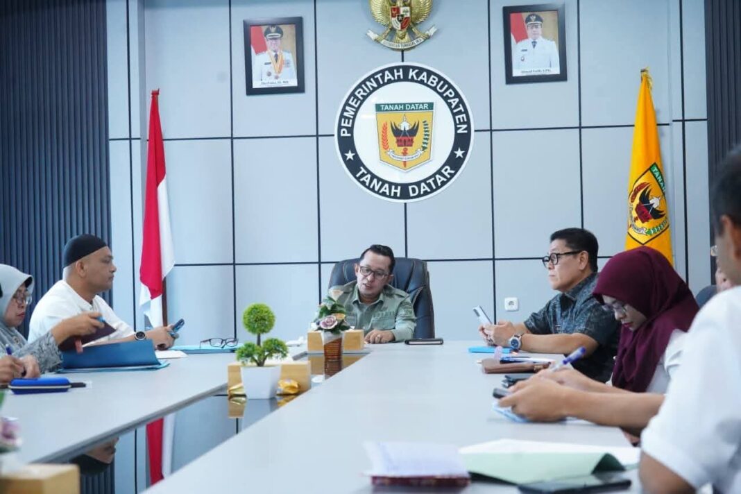 Batusangkar, Tanah Datar – Bupati Tanah Datar Eka Putra hadiri Rapat Koordinasi (Rakor) Tingkat Menteri Satuan Tugas Rehab dan Rekontruksi (Satgas RR) Pascabencana di Provinsi Aceh, Sumut dan Sumbar via virtual, Jum’at (27/2/2026) di ruang rapat Bupati.