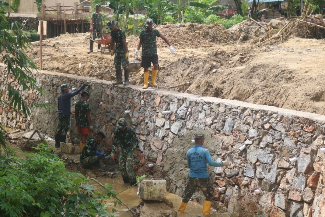 Dengan penuh semangat, para personel TNI bersama warga setempat meratakan adonan semen pada permukaan susunan batu untuk memperkuat struktur dinding penahan tanah tersebut.