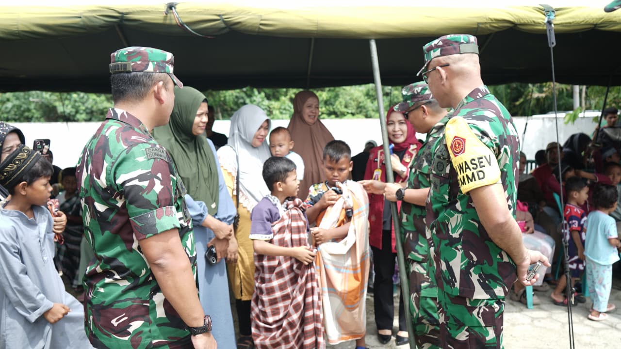 Kolonel Inf Yanto R. Naingggolan menyambangi beberapa anak yang telah melaksanakan sunat masal dengan menyapa dan memberikan salam dengan suasana hangat dan akrab.