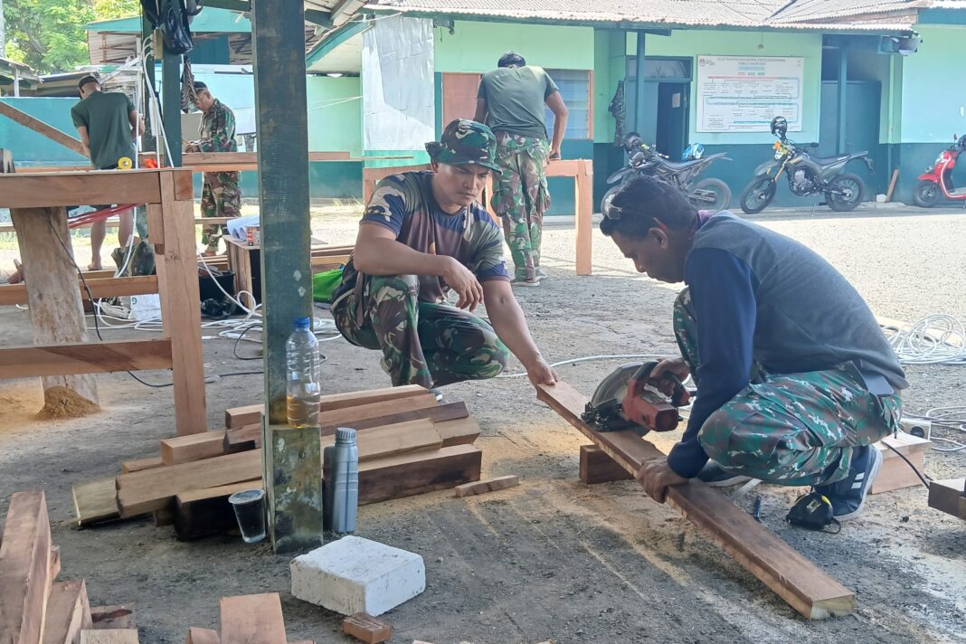 Kegiatan pembuatan kusen tersebut dilaksanakan di halaman Markas Komando Rayon Militer (Makoramil) 1708/BN, yang terletak di Jalan Sriwijaya, Distrik Samofa, Kabupaten Biak Numfor, pada Senin (27/4/2026).