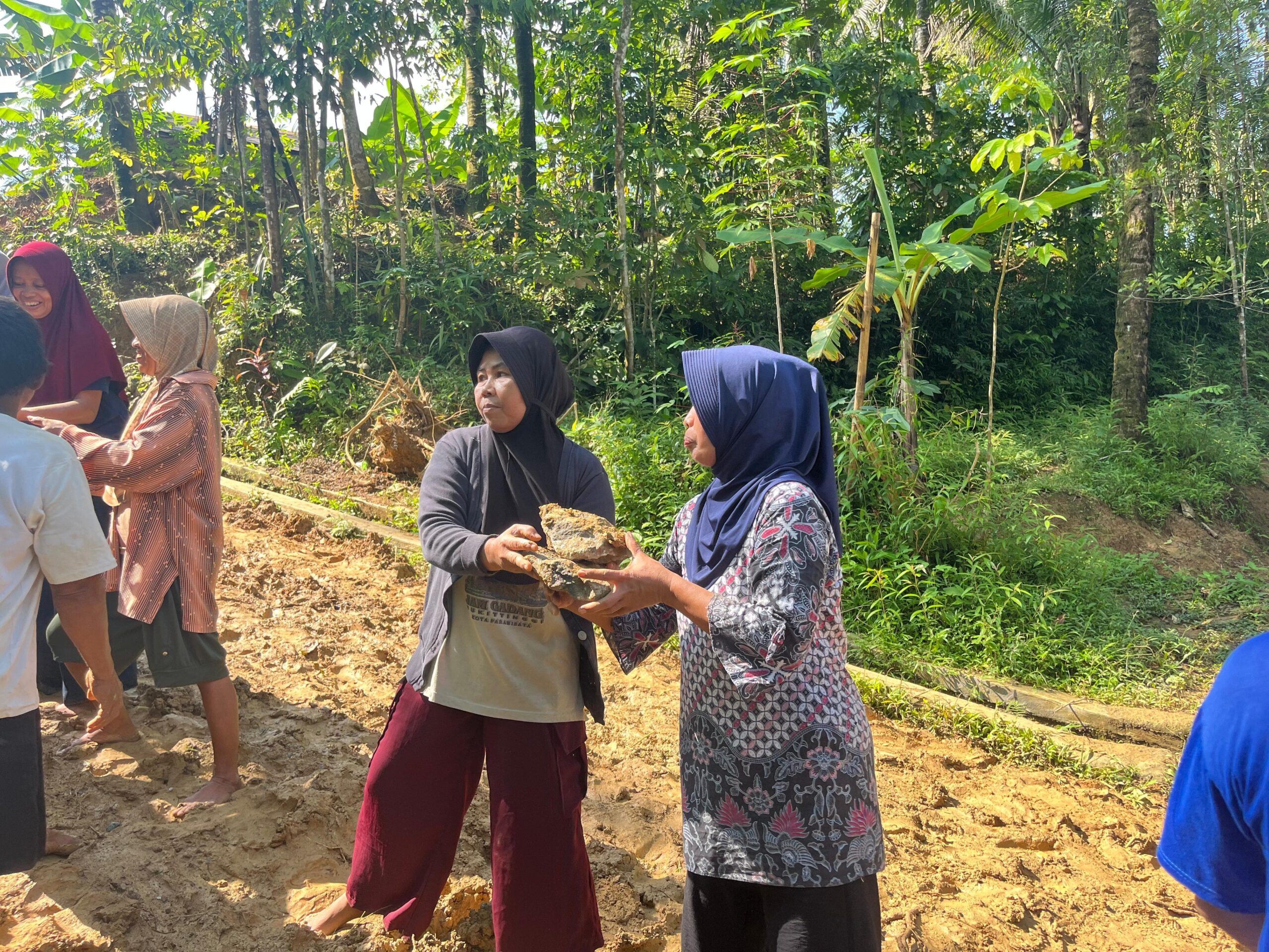Menariknya, di antara barisan tersebut, terlihat beberapa ibu-ibu desa yang begitu aktif. Dengan langkah pasti dan raut wajah penuh semangat, mereka tidak ragu ikut mengangkat batu, menyatu dan gotong royong bersama para bapak-bapak.