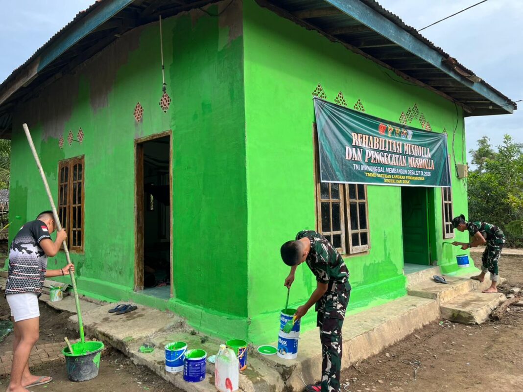 Dengan semangat gotong royong, anggota Satgas TMMD dan masyarakat bahu-membahu menyelesaikan berbagai pekerjaan, mulai dari perbaikan atap, dinding, lantai, hingga pengecatan seluruh bagian mushola.