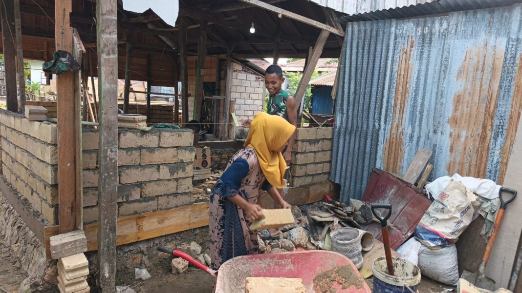 Kendari – Semangat gotong royong terpancar jelas di Kelurahan Petoaha saat Ibu Ninda, pemilik rumah yang menjadi sasaran program Rehabilitasi Rumah Tidak Layak Huni (RTLH), turun langsung membantu personel Satgas TMMD ke-127 Kodim 1417/Kendari. Sabtu (28/02).