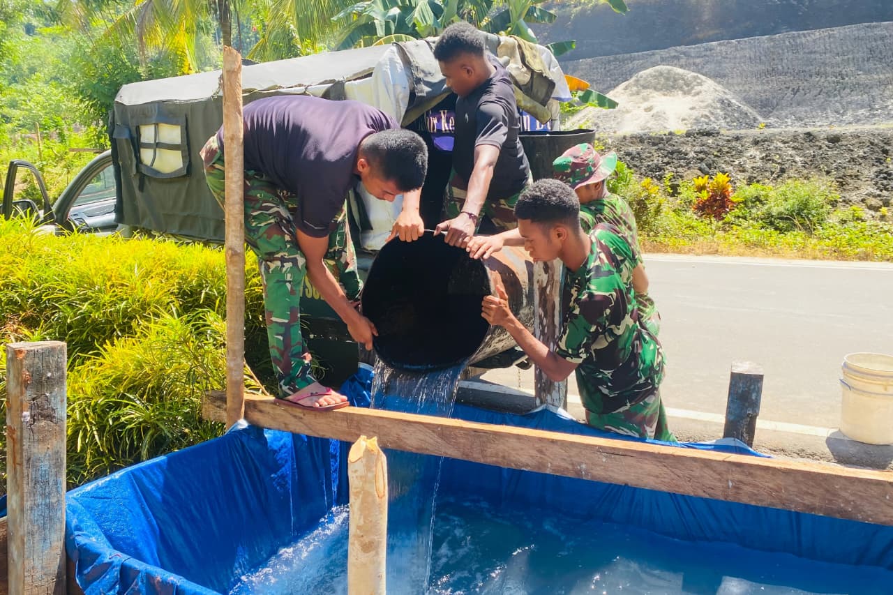 Setibanya di lokasi, air langsung dituangkan ke dalam bak penampungan yang sebelumnya telah dibuat oleh personel satgas. Bak ini menjadi solusi sementara agar pekerjaan tetap berjalan.