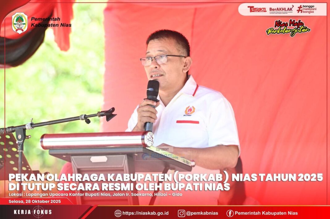 Nias, Sumatera Utara,dutametro.com -Pemerintah Kabupaten Nias melalui Panitia Pelaksana Pekan Olahraga Kabupaten (PORKAB) Nias Tahun 2025 secara resmi menutup seluruh rangkaian kegiatan olahraga Tingkat Kabupaten bertempat di Lapangan Upacara Kantor Bupati Nias, Jl. Soekarno, Hilizoi – Gido. Selasa, 28/10/2025.
