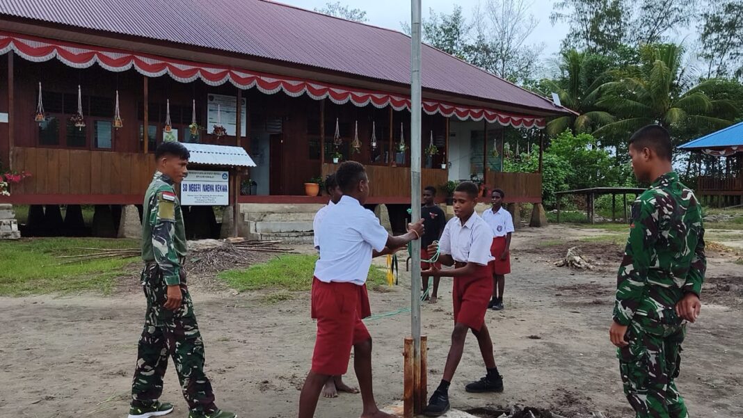 Personel Satgas TMMD ke-128 Kodim 1710/Mimika terus menunjukkan kepedulian terhadap pembinaan generasi muda melalui kegiatan pelatihan Peraturan Baris Berbaris (PBB) dan tata cara pengibaran bendera kepada siswa-siswi SD Negeri Naena Keakwa, Kampung Keakwa, Rabu, (29/4/2026). Kegiatan tersebut dilaksanakan sebagai bagian dari persiapan upacara Hari Pendidikan Nasional (Hardiknas).