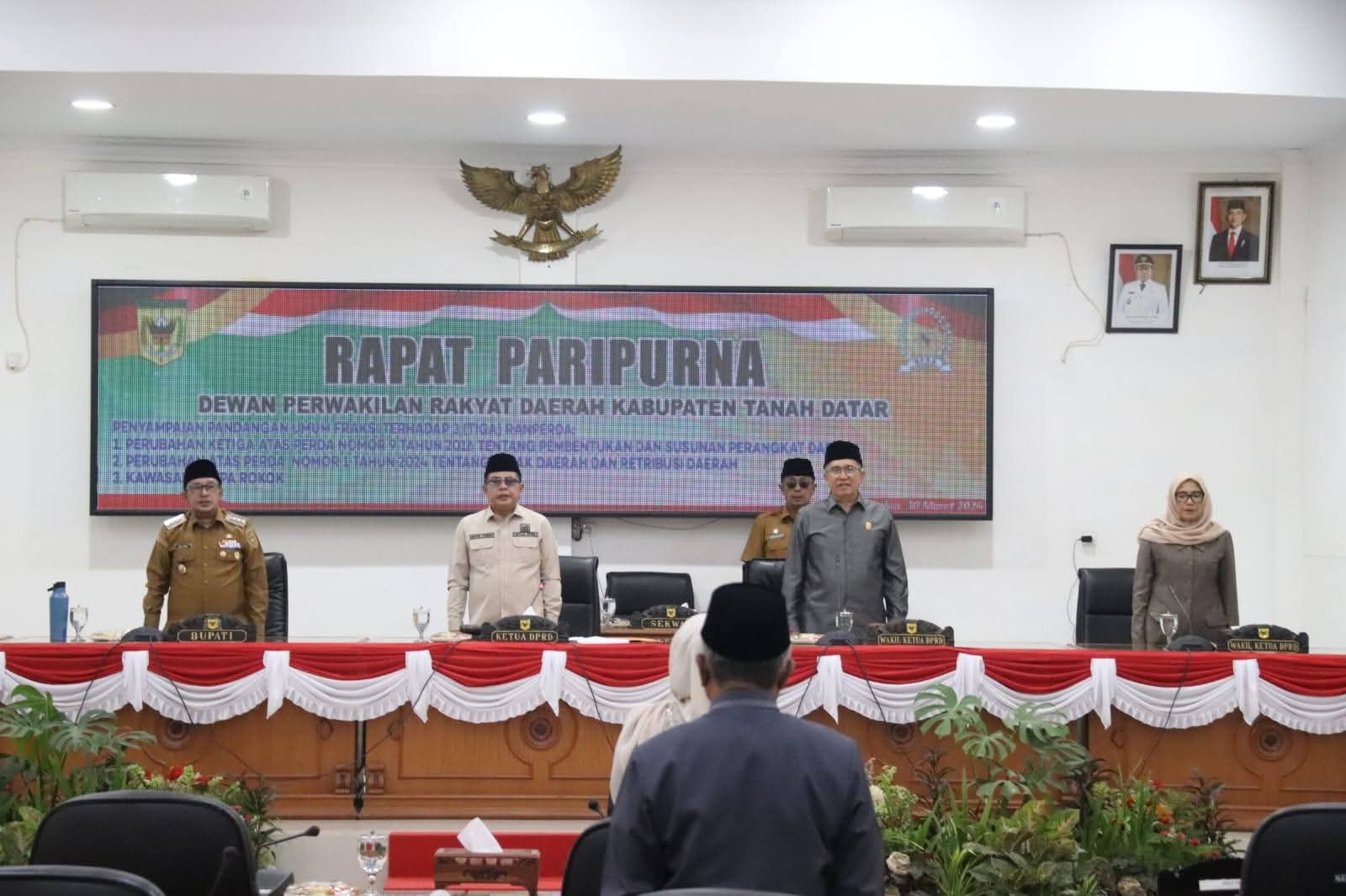 Batusangkar, Tanah Datar – Rapat Paripurna Dewan Perwakilan Rakyat Daerah (DPRD) Kabupaten Tanah Datar dalam rangka Penyampaian Pandangan Umum Fraksi terhadap 3 (tiga) Ranperda, Senin (30/3/2026) du ruang sidang utama DPRD dipimpin Ketua DPRD Anton Yondra didampingi Wakil Ketua Nurhamdi Zahari dan Kamrita serta dihadiri Bupati Eka Putra.