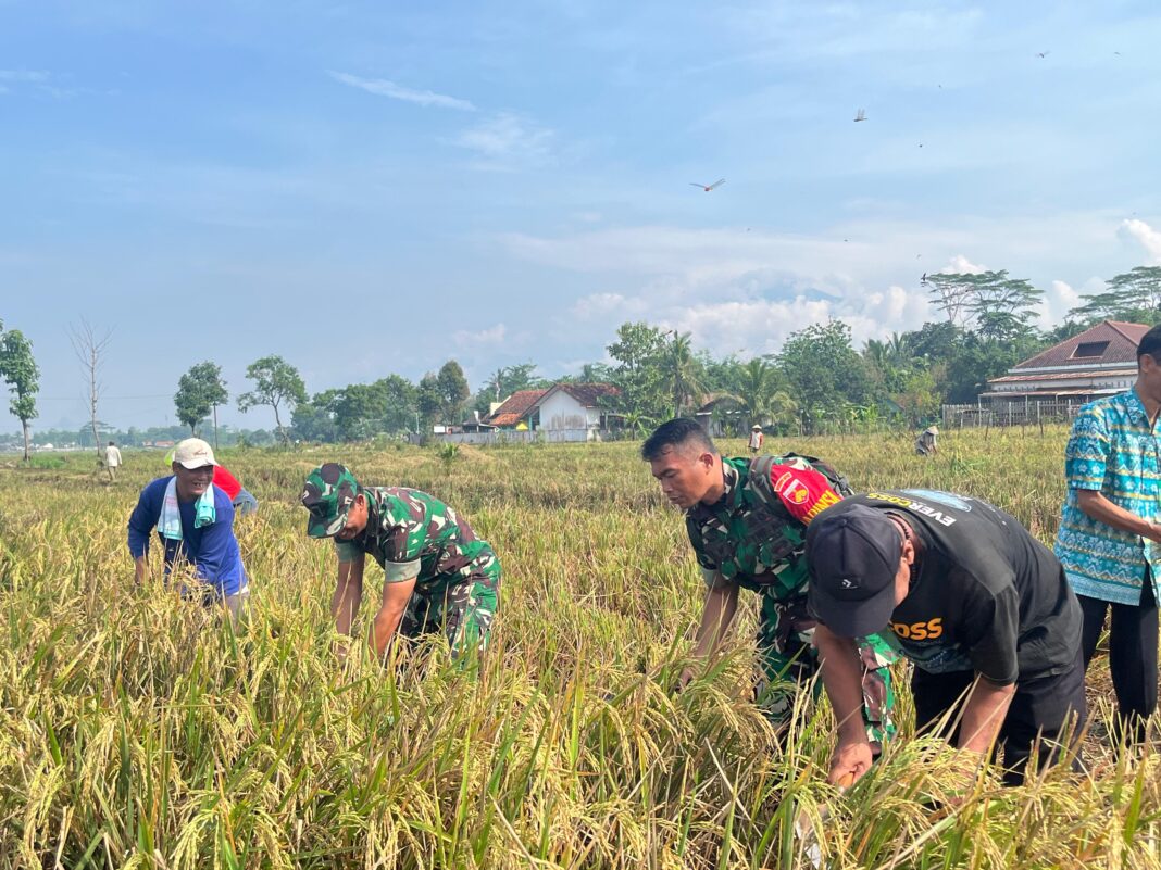 Tidak ada sekat antara seragam loreng ataupun pakaian petani, keduanya menyatu dalam satu irama untuk memanen bulir demi bulir padi yang telah menguning.