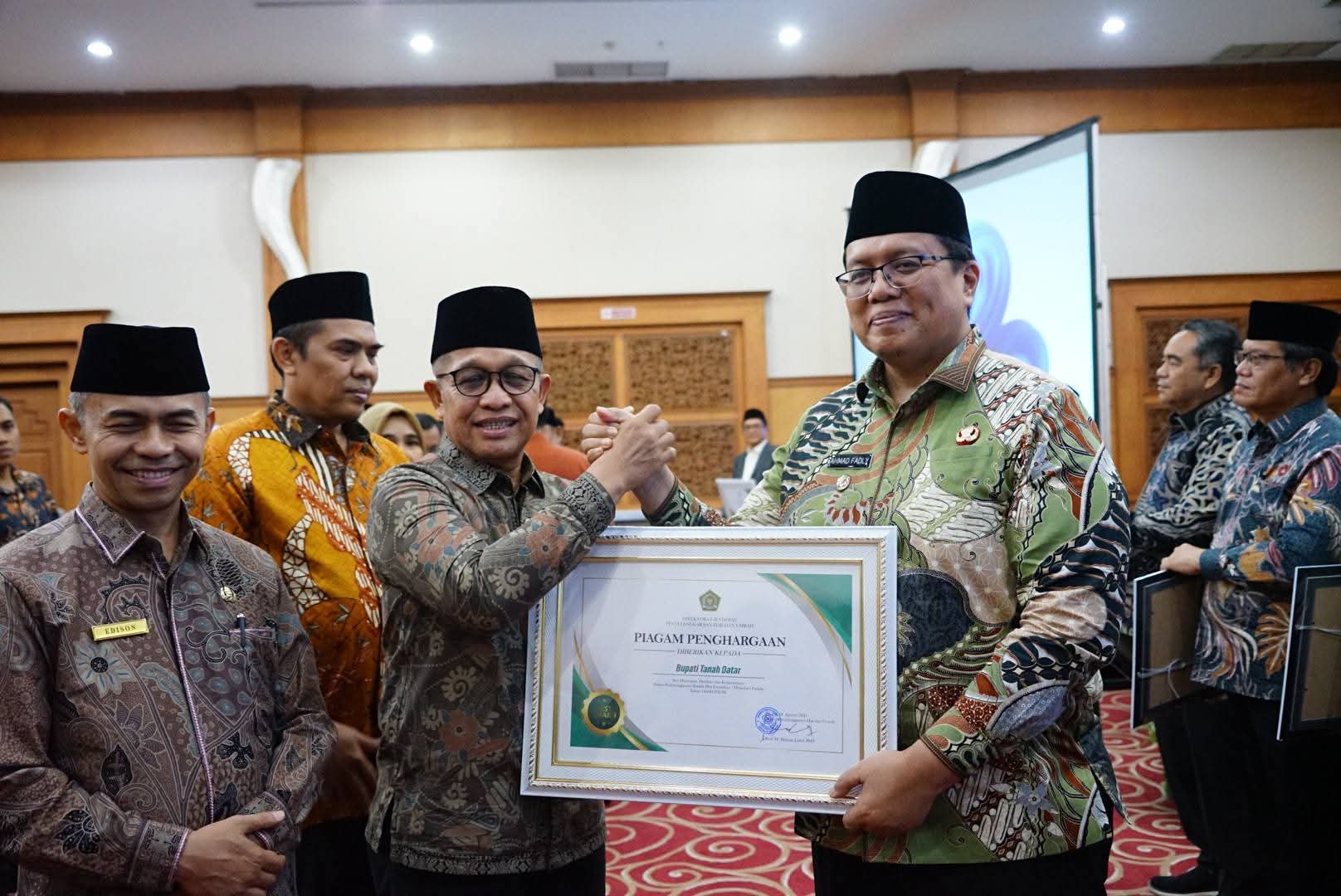 Di kesempatan tersebut, Kementerian Agama Republik Indonesia melalui Direktorat Jenderal Penyelenggaraan Haji dan Umrah (PHU) RI memberikan piagam penghargaan kepada seluruh Kepala Daerah se Sumatera Barat termasuk Bupati Tanah Datar yang diterima Wakil Bupati Ahmad Fadly yang malam itu juga didampingi Kakan Kemenag Tanah Datar H. Amril dan Kabag Kesra H. Afrizon.