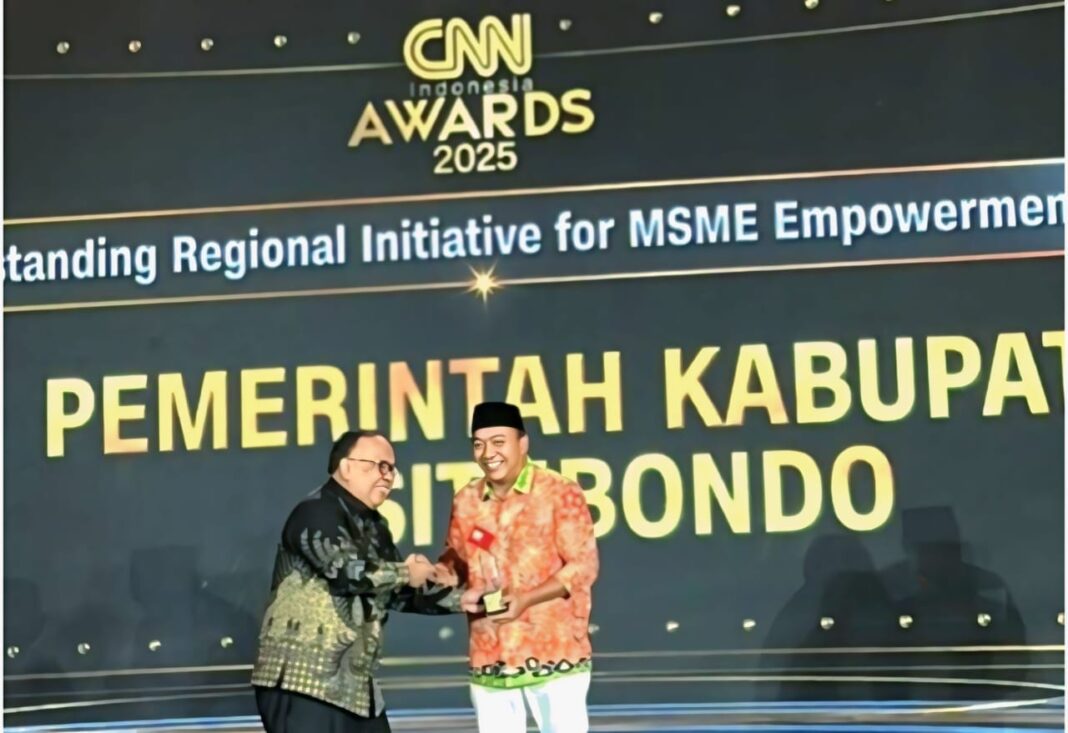 Situbondo, dutametro.com – Pemerintah Kabupaten Situbondo kembali menorehkan prestasi membanggakan di kancah nasional. Untuk kesekian kalinya, Situbondo berhasil meraih penghargaan CNN Indonesia Awards 2025 dalam kategori Outstanding Regional Initiative for MSME Empowerment, yang diserahkan langsung di Jakarta pada Jumat (31/10/2025).